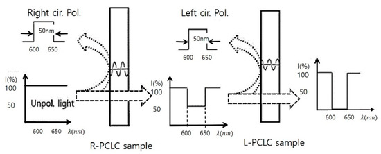 Principle of a circular polarizer by one R-PCLC (or L-PCLC) and a notch filter by two R- PCLCs. A notch filter works for unpolarized incident light, right-circularly polarized light in a photonic band is reflected at the R-PCLC cell, and then left-circularly polarized light in the same photonic band is reflected at the L-PCLC cell, in turn.