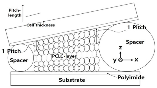 To realize the continuous wavelength tunability of circular polarization in a broad spectral range over 500 nm, the use of a wedge PCLC cell structure and a continuous pitch formation in the wedge direction of the cell could be one solution (see Figure 2). As a critical and required condition, the pitch gradient of PCLCs must match the spiral pitch change determined by cell thickness change in the wedge direction of the PCLC cell [18]. Figure 2 shows a schematic diagram of the PCLC structure corresponding to the ideal PCLC wedge cell with a continuous pitch gradient. Cholesteric helical pitches are quantized with the number of half-turns [13,19] to satisfy the boundary condition of the wedge CLC cell with an alignment layer. Along the wedge direction (+x-direction in Figure 2), a linear increase in the helical pitch (p) continuously occurred. Therefore, spatially, the wavelength position of the PBG () also continuously changed according to the pitch change along the wedge direction on the PCLC cell. A method to fabricate the PCLC wedge cell structure with a pitch gradient over 500 nm spectral range is shown in Section 3 (Fabrication of PCLC cells).