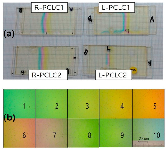 (a) Photographs of well-developed wedge cells of R-PCLC1, R-PCLC2, L-PCLC1, and L-PCLC2 placed on a plotting paper, and (b) Juxtaposition of ten polarized microscope photographs at different spatial positions of the R-PCLC1 cell, respectively.