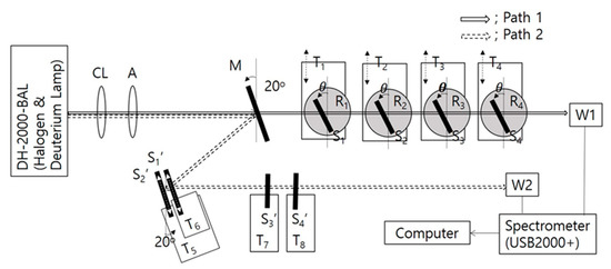 Figure 4 shows the experimental setup containing two different paths (1 and 2). Path 1 was used to verify the functionality of notched filters and circular polarizers in R-PCLC and L-PCLC cells. Path 2 was used to check the function of a bandpass filter. When Path 1 was selected, the Ag mirror (M; Average reflectance > 98%) in Path 1 had to be removed. Depending on the purpose of the device, the number of PCLC cells was determined. Each PCLC cell was located above the rotator, which was placed on a translation stage. Transmitted data of PCLC cells were collected independently by moving each translation stage in a lateral direction or by varying the angle of incidence using each rotator. Light signals from PCLC cells were acquired through waveguides (W1 or W2) with a spectrometer (OOI, USB2000+).