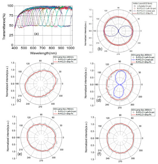 Polar plots are obtained by using the halogen and deuterium lamp (OOI system); the left-circularly polarized lights passed through the R-PCLC1 cell with a PBG center wavelength at 450 nm (c), 633 nm (d), 780 nm (e), and 900 nm (f), respectively. Each solid red line is fitting curves by the elliptic equation. The data (△) in (d) are a linearly polarized light intensity that is converted from the data (o) of (d) by a plate (632.8 nm). The length of semi-major axis a, the length of semi-minor axis b, and the ellipticity (b/a) of the ellipse obtained from the fitting data are given in Table 1.