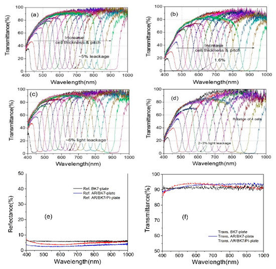 Figure 6c shows the notch spectrum from ~430 nm to ~940 nm by rotation using a set of notch systems consisting of an R-PCLC1 cell placed on the rotator R1 and an L-PCLC1 cell placed on the rotator R2. Placing cells at a distance of ~2.6 cm from the rotation axis could change the wavelength in the broader wavelength area as cells rotated. This was due to the simultaneous effect of the PBG moving to different locations and increasing the angle of incidence for CLC cells. Data were collected by rotating R1 and R2 between –20 and +20 degrees while maintaining the same PBG position for both cells. There was some light leakage of up to ~6% within the band across the spectral range. Figure 6d shows notch spectra from 440 nm to 950 nm using the multiple cell reflection method by rotation with two sets of notch filters. Using two sets of notches, when rotating the cells to collect data, the light leakage within the band was 2~3% due to the discrepancy in the refractive index between the PCLC layer and PI layer (Figure 6d as in the Figure 6b result). In the results of Figure 6a,c, employing one notch filter set, the transmittance in the outer region of the band was greater than 90% in the wavelength region of more than 600 nm. In the wavelength region from 600 nm to 400 nm, the band’s transmittance of the outer region decreased from ~90% to 40%. In Figure 6b,d, with two notch filter sets, the transmittance in the outer region of the band was ~90% in the wavelength region of more than 600 nm. When the wavelength decreased from 600 nm to 400 nm, the band’s transmittance of the outer region decreased from ~90% to 20%, which seemed to be mainly due to absorption and refractive index mismatch at boundaries of the PCLC layer and the PI layer. From the Figure 6b,d results, in order to experimentally examine the effect of the PI layer on the serious decrease in transmittance from 600 nm to 400 nm, the reflectance and transmittance of the substrate used to manufacture the PCLC cell were investigated. Figure 6e shows the reflectance of the BK7 plate, AR/BK7 plate, and AR/BK7/PI plate. Additionally, Figure 6f shows the transmittance of the BK7 plate, the AR/BK7 plate, and the AR/BK7/PI plate, respectively. In the case of AR/BK7 substrates, AR coating on one side of the BK7 substrate reduces (increases) reflectance (transmittance) uniformly in the wavelength region of 400 nm to 1000 nm. However, for the AR/BK7/PI plate, the reflectance (transmittance) rate increases (decreases) again, and this effect increases, especially as it moves from the 600 nm to 400 nm region. This seems to be the effect of refractive index mismatch and absorption at the interface between the BK7/PI layers in this wavelength region. Therefore, as the number of PCLC cells used increases, the number of substrates increases, and the transmission results of Figure 6b,d appear, and this part needs to be improved further in the future.