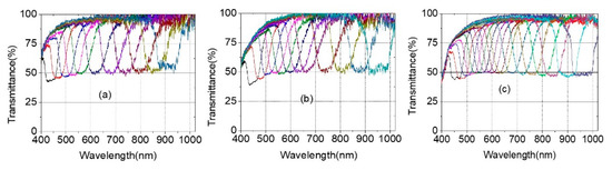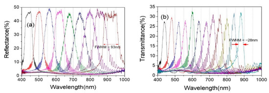 Meanwhile, the PBG position of R-PCLC2 moved to have a PBG position between 802 nm and 895 nm. Therefore, only the right-circularly polarized light at 867~895 nm is reflected by the R-PCLC2 cell. Thus, bandwidth could be decreased from 93 nm to 28 nm. The bandwidth of the bandpass filter system could be reversibly controlled from ~28 nm to 93 nm by moving the PBG position of the R-PCLC2 cell. As the bandwidth decreases, the peak intensity can be reduced. Figure 8b shows bandwidth-reduced bandpass filter spectra from a range of ~425 nm to 895 nm. The transmission does not fall to zero in the outer region of the band in the bandpass filter, which seems to be due to a mismatch in the refractive index at the boundary. Further research seems to be needed on this. In addition, the ripple, which increases the period toward the long wavelength at the band edge, also appears to have occurred due to a refractive index mismatch on the glass substrate.