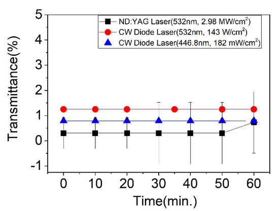 Stability and transmittance of filters via a high-pulse ND: YAG laser (■) at 532 nm and a CW diode laser at 532 nm (●) and a CW diode laser at 446.8 nm (▲) for one hour.