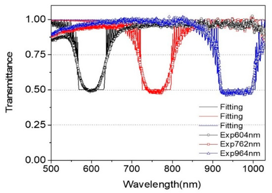 As shown in Figure 5 and Figure 10, when chiral concentration decreased continuously or moved to the thicker direction of the R-PCLC1 cell, the PBG position shifted toward the long wavelength and the bandwidth increased simultaneously. To study variations in the optical constants (i.e., refractive index, pitch, full width at half maximum (FWHM) of the band thickness) of PBGs, three different PBG experimental data with three other wavelength locations were selected and analyzed theoretically. Figure 12 shows three transmittance data of PBGs with center wavelength positions () 600 nm, 762 nm, and 964 nm of the R-PCLC1 cell. Solid lines are theoretical fitting data using Berreman’s 4 × 4 matrix method [23,24,25]. Theoretical fitting parameters, refractive index, and thicknesses for these three PBGs are given in Table 2. Additionally, the pitches were obtained by dividing the center wavelength of each PBG by the obtained average refractive index. Other fitting parameters are given for the BK7 substrate with a thickness of 1 mm and a refractive index of 1.5129. In the theoretical fitting, the polyimide (PI) layer was ignored. Due to the AR layer on BK7 in the CLC cell structure (Figure 2), the reflectance at each boundary surface of air/AR layer/BK7 layers was also ignored.