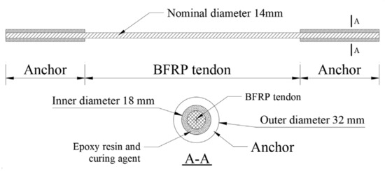 The nominal diameter of the test BFRP tendons was 14 mm with an area of 153 mm2. The configuration of the bonded anchors for the BFRP tendons is depicted in Figure 1. The anchors were fabricated by a circular steel tube, and the length of each anchor was 450 mm with the inner and outer diameters of 18 mm and 32 mm, respectively.