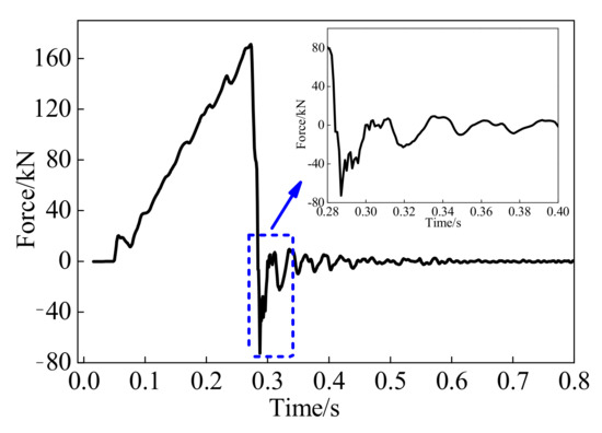 Moreover, the natural period of the whole test system, including the actuator, loading jags, slider, reaction stub, and BFRP tendon with bonded anchors, requires careful examination. If the natural period of the test system is longer than the loading time of the BFRP tendon, the load cell in the actuator may not correctly track the true applied force owing to the test system and specimen interaction. Through the free vibration of the whole test system, the estimated natural period is obtained and compared to the loading time. After that, the loading rates can be verified [26]. A typical force-time history after a specimen fractured is depicted in Figure 3. It can be estimated that the natural period of the whole test system is about 18 ms, which is shorter than the fracture time for a specimen of 170 ms, with a minimum loading time of 32.5 ms.