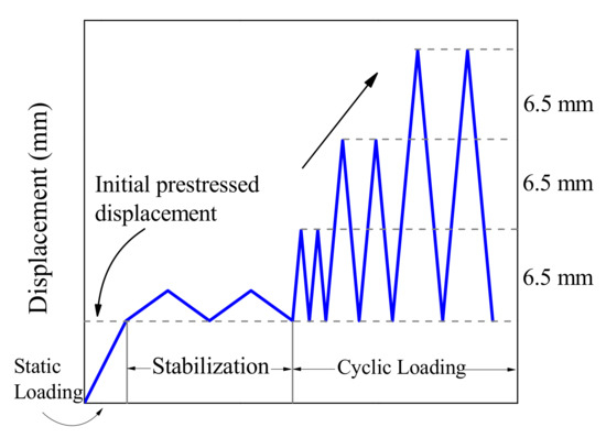 In the hysteretic loading condition, all specimens were initially prestressed under a loading rate of 0.1 mm/s before the cyclic loading. The initial prestressed displacements were selected as 4 mm (15% of the deformation capability), 8 mm (25% of the deformation capability), and 12 mm (35% of the deformation capability) to simulate the prestressed force in actual engineering. Then the specimen was applied with a slight loading displacement under a slow loading rate for stabilization. The loading protocol had an incremental displacement amplitude of Δ = 6.5 mm, representing the 1% story drift for the scaled prototype structure. Each loading amplitude was cycled twice to verify the stability of the BFRP tendon, as illustrated in Figure 8. After each loading amplitude, the actuator was returned to the initial prestressed position and prepared for the next loading.