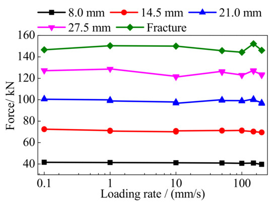 A displacement-controlled loading protocol was adopted in this paper. Under the monotonic loading condition, the specimens were directly loaded to fracture under the loading rates of 0.1 mm/s, 50 mm/s, and 200 mm/s.