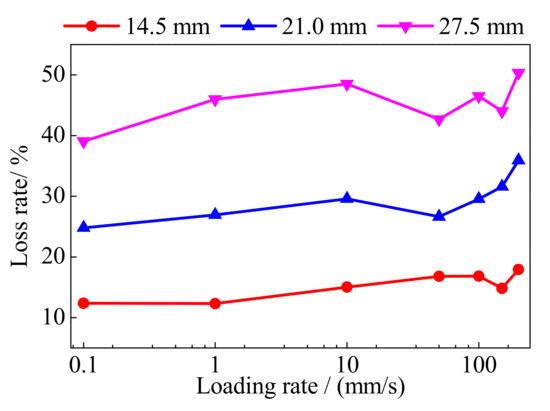 Figure 11 shows the loss rate of the prestressed force of the BFRP tendons under different loading rates. With the increase in the loading displacement, the loss rate of the prestressed force increased because of the greater anchor colloidal deformation. It is worth noting that the loss rate of the prestressed force increased with the greater loading rate. The maximum loss rate under the loading rate of 200 mm/s was greater than that under 0.1 mm/s, and the difference of prestressed force loss was greater than 3.65 kN which accounted for 11% of the prestressed force of the BFRP tendon. Owing to the composite material of the BFRP tendons, the bond behaviors of the BFRP fibers were affected by the high loading rate. However, 3.65 kN only accounted for less than 2.5% of the bearing capacity of the BFRP tendons. For the prestressed BFRP tendons, the deformation and bearing capacities require more attention. Thus, the increased loss of the prestressed force under a greater loading rate can be avoided by a greater prestressed force. Although the prestressed loss rates show slight loading rate dependency, they can be neglected when anticipating the hysteretic behavior of the BFRP tendons.