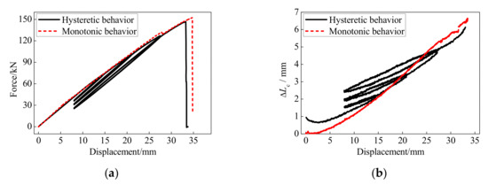 The force-displacement and anchor colloidal deformation curves of the BFRP tendons under the monotonic and hysteretic loadings are illustrated in Figure 13. The BFRP tendons presented similar behaviors under the monotonic and hysteretic loadings. Although the deformation and bearing capacities of the BFRP tendons under the monotonic loading were 4% greater than that under the hysteretic loading, very similar skeleton curves are shown with hysteretic and monotonic behaviors. Therefore, the anchor colloidal deformations of the BFRP tendons under the monotonic loading can anticipate this under the hysteretic loading.
