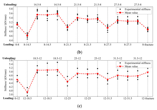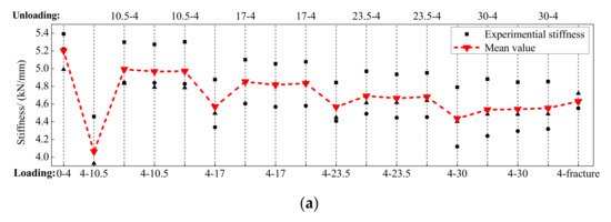 The secant stiffness of the BFRP tendons during the whole loading process is calculated in Figure 14. The abscissa represents the entire loading process, and the abscissa values mean the start and end of the loading displacements. For example, the abscissa value of 4–10.5 means that the BFRP tendon was loaded from 4 mm to 10.5 mm, while the value of 10.5–4 implies that the BFRP tendon was unloaded from 10.5 mm to 4 mm. As mentioned above, each amplitude was conducted two times, and the second appearance of the abscissa value refers to the second loading and unloading cycle.