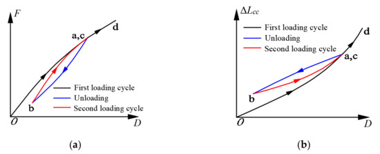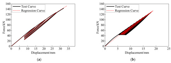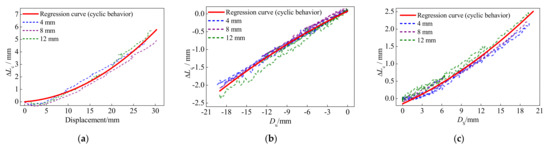 Because of the different paths of the BFRP tendons in the first loading, unloading, and second loading cycles, the anchor colloidal deformations need to be analyzed separately. The anchor colloidal deformation in the initial loading cycle is similar to that under the monotonic loading (Figure 13), and the regression formula is the same as the BFRP tendons under the monotonic loading, as expressed in Equation (3). The regression formulas of the anchor colloidal deformations in the unloading cycle, , and second loading cycle, , are defined as follows:
