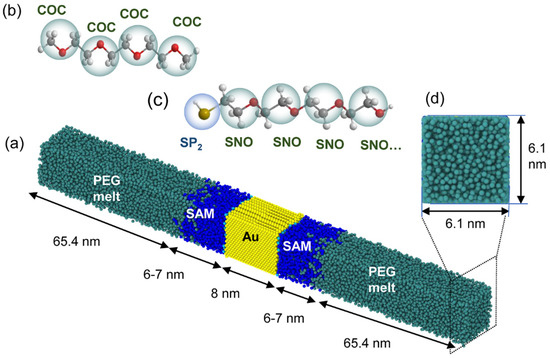 Figure 1 shows the schematic of the system comprising three layers. The organic layer was made of PEG at each end of the system. The SAMs were grafted on the inorganic gold layer, which was in the middle of the system. The cross-section of the system had a size of 6.1 nm × 6.1 nm (Figure 1d). The thickness of the gold layer was 8 nm, which was enough to avoid the size effect [31]. The thickness of the SAM ranged from 6 to 7 nm due to different equilibrium angles of the SAM chains. To eliminate the size effect of PEG, we calculated thermal resistance for different PEG sizes that were much larger than the mean free path of PEG. The ITR between the gold and PEG melt was calculated in the directions parallel to the heat flow. The results showed that the size effect was evident in the horizontal direction but not apparent in the vertical direction (Figure S1 in the Supplementary Materials), as depicted in Figure 1a.