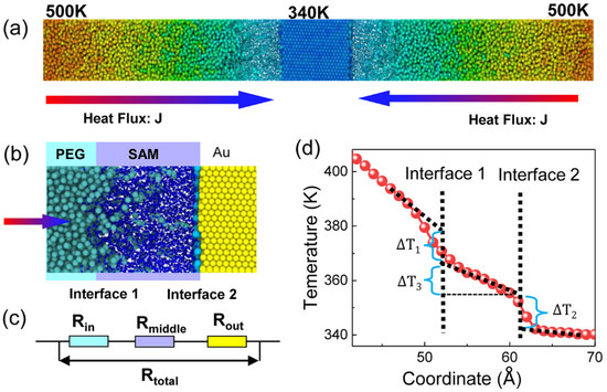 (a) Heat flux J applied at the ends of the system, generating temperature distribution along with the system. The heat source and heat sink temperatures were controlled at 500 K and 340 K, respectively. (b) Locations of interface “1” and interface “2.” (c) Serial model of the total thermal resistance between gold and PEG. (d) Temperature profile near the interface and calculation of temperature drop.