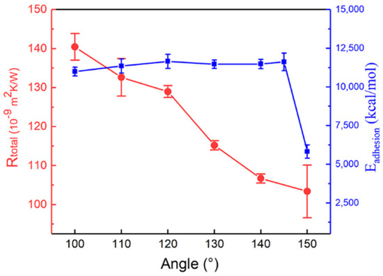 Figure 3 shows a marked decreasing trend in with an increasing SAM angle. Previous research suggested that, the stronger the interfacial adhesion energy between self-assembled monolayers and soft materials, the less ITR [18]. To further verify this conclusion, we calculated interfacial adhesion energy using the following formula [7]