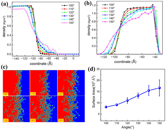 Microstructure of the interface: (a,b) density profiles of each component perpendicular to the interface for the PEG and SAM, respectively. (c) Surface morphology of the contact area between the PEG (blue color) and SAM (red color) for various equilibrium angles. (d) An interfacial area as a function of the equilibrium angle.