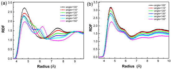In Figure 4c, qualitative studies showed that the contact region enlarged as the angle increased. However, the contact area had no detectable differences when the angle value exceeded 130°. We quantitatively estimated the surface contact area by computing the surface area between PEG melt and SAM using the “construct surface mesh” command in OVITO [37]. This command has its algorithm for controlling a probe sphere to capture the surface details of PEG. In all studies, the radius of the probe sphere was adopted as 4.3 Å according to the first peak position of the RDF curve (Figure 5b). Figure 4d showed that the interfacial contact area was positively correlated with the angle. It can be concluded that, when the SAM angle increases, PEG penetrates SAM, increasing the contact area, which promotes the heat propagation between the PEG melt and SAM molecules. Thus, the between gold and PEG melt decreases.