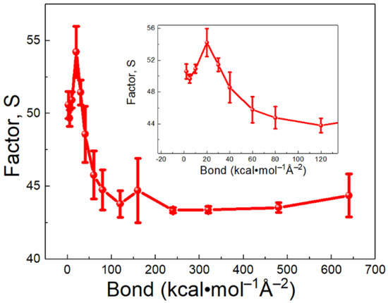 From the force field energy function according to Equation (7), and tend to occupy a significant proportion of all function items and are demonstrated to be substantial in polymer thermal transport [36]. Hence, we focused on two main structural factors: SAM equilibrium angle of backbone and bond stretching defined in Formulas (8) and (9). The angle was among three SNO beads. Similarly, the bond strength was between two SNO beads.