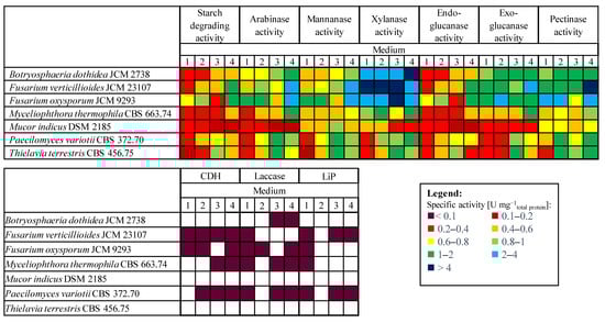 Lignin degradation by fungi was carried out by oxidoreductases like phenol oxidases (laccase) or heme peroxidases (lignin peroxidase (LiP), manganese peroxidase (MnP) or versatile peroxidase (VP)). Out of all the tested fungi, some laccase activity was shown by P. variotti, F. oxysporum, M. thermophila, and B. dothidea, while LiP activity was detected in the supernatants of F. verticillioides and P. variotii. Even though these activities were detected, they were lower than 0.1 U mg−1, which is in accordance with data reported for other soft rot fungi like Alternaria alternata, Penicillium chrysogenum, Botrytis cinerea, and Fusarium sp. [58,59].