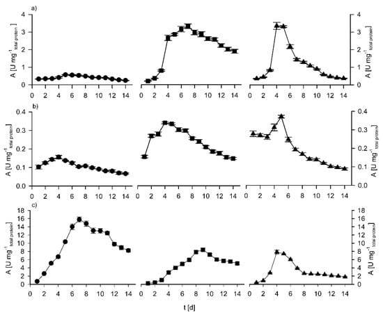 During the cultivation of selected fungi, F. oxysporum and F. verticillioides grew in a filamentous morphological form that moderately increased broth viscosity, but it was still possible to maintain good recirculation and mixing of media [66]. As stated, xylanase and endoglucanase production during sequential cultivation seemed to be induced by the presence of the lignocellulosic biomass and the maximum determined enzymatic activities occurred when the added carbon source was exhausted. The added glucose in the fermentation broth for the cultivation of the selected fungi was decomposed after one day of cultivation (data not shown). Maximum exoglucanase activity during cultivation of F. verticillioides was achieved after 5 days of cultivation (Figure 2) and was 0.56 U mg−1total protein. In comparison, in the sequential solid state and submerged cultivation of F. oxysporum, maximum exoglucanase activity was determined to be more than 6 times higher (3.33 U mg−1). This activity was achieved after 7 days of cultivation. F. oxysporum also showed 2 times higher endoglucanase activity (0.33 U mg−1) in comparison with F. verticillioides (0.15 U mg−1). Maximum endoglucanase activities were achieved after 4 days of cultivation (Figure 2).