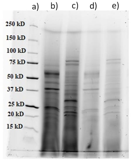 Before the electrophoresis was started, 20 µL of Laemmli sample buffer (Bio-Rad, Hercules, CA, USA) was added to the crude and partially purified samples. The samples were then heated by using a digital dry bath to 98 °C and were kept at that temperature for 5 min. For the electrophoresis, Mini-PROTEAN TGX Precast Gels (Bio-Rad, Hercules, CA, USA), Mini PROTEAN Tetra Cell (Bio-Rad, Hercules, CA, USA), and the PowerPac HC (Bio-Rad, Hercules, CA, USA) power supply were used. The buffer tank was filled with the reused 1× running buffer, while the reservoir between the gels was filled with a freshly prepared and 10 times diluted 10× running buffer (30.3 g L−1 TRIZMA base, 144 g L−1 glycine, 10 g L−1 SDS (Sigma Aldrich, St. Louis, MO, USA)). One well was used for 15 µL of the unstained Precision Plus Protein Standard (Bio-Rad, Hercules, CA, USA) while the other four wells were loaded with 15 µL of the denatured samples. The samples were run at 120 V for about an hour. After the electrophoresis was finished, the gels were stained using QC Colloidal Coomassie (Bio-Rad, Hercules, CA, USA) and washed using distilled water. A picture of the gel was taken using the Universal Hood II Gel Doc System (Bio-Rad, Hercules, CA, USA).