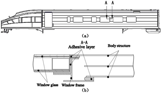 (a) Schematic diagram of the high-speed train, (b) schematic diagram of side window adhesive structure.