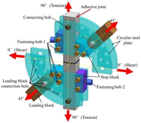To study the adhesive joints under different stress states, an improved Arcan fixture (as shown in Figure 4) was developed and manufactured, which could realize the combined loading of tensile and shear stress [21]. The fixture was mainly composed of semicircular steel plates, loading blocks, positioning blocks, limiting blocks, connecting bolts, positioning bolts, and fastening bolts. The semicircular steel plate consisted of four independent steel plates with multiple holes, the thickness of which was 6 mm. The holes on the steel plates were respectively used for connection, limit, and positioning, so that the loading direction was related to the joint movement. Positioning blocks, limiting blocks, fastening bolts, and positioning bolts were set on both sides of the adhesive joint to fix and determine the joint. Fastening bolts connected the positioning blocks, the limiting blocks, and the semicircular steel plates. Two connecting bolts were used to connect the adhesive joint to ensure uniform load transfer. The specific stress state could be obtained at the adhesive joint by loading the circular steel plate with different angles by the loading blocks.