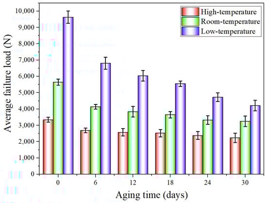 The average failure loads of TASJs are shown in Figure 8. At high temperature, compared with unaged, the failure load decreases by 19.5%, 22.9%, 24.6%, 28.7%, and 33.0% at 6, 12, 18, 24, and 30 days of hygrothermal aging. At room temperature, compared with unaged, the failure load decreases by 26.9%, 32.1%, 35.4%, 41.2%, and 42.5% at 6, 12, 18, 24, and 30 days of hygrothermal aging. At low temperature, compared with unaged, the failure loads at 6, 12, 18, 24, and 30 days of hygrothermal aging decrease by 29.3%, 37.3%, 42.3%, 50.9%, and 56.2%, respectively. With the increase of aging time, the decline rate of failure load decreases gradually. After hygrothermal aging, the failure load at low temperature reduces the most. In contrast, at high temperature, it decreases the least, which indicates that the mechanical properties at low-temperature reduce most obviously after hygrothermal aging.