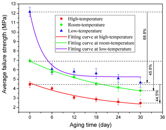 It is found that the failure loads of the joints decrease obviously at the initial stage, and the decline rate gradually decreases with the increasing of the aging time. After aging for 6 days, the failure loads obviously decrease; this is because the polymer chain breaking for the longest duration, the fastest breaking speed, and the fastest decreasing cross-linking density are all seen at the early aging stage [22], leading to a significant reduction of the average failure loads of the joints. The results show that the interface failure of the joints at low temperature obviously occurs after 6 days (see the discussion in Section 3.3), which reflects the apparent change of failure load. The failure load at low temperature decreases to the largest extent, while the decline at high temperature is the least, which also shows that the joints’ mechanical properties at low temperature decrease most obviously after hygrothermal aging. In addition, the data dispersion increases at low temperature, which indicates that the data consistency is poor at low temperature.