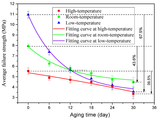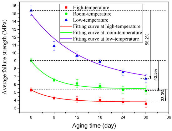To obtain the change rule of the joint average failure strength with aging time, according to the changing trend of the joint failure strength, the exponential function was used to fit the data, and the fitting curves of three types of adhesive joints were obtained, as shown in Figure 9, Figure 10 and Figure 11. The failure strength decreases with aging time. With the increase of test temperature, the failure strength decreases slowly. With the decrease of the proportion of normal stress in the joint, the decline of failure strength decreases gradually. The function expressions of the fitting curves are shown in Table 3. It is found that the fitting accuracy R2 is above 0.90, which indicates that the exponential function can obtain very satisfactory fitting accuracy. From the overall trend, the fitting impact is better at room temperature and low temperature, which indicates that the dispersion of joint failure strength is small. At the same time, it is relatively poor at high temperature.