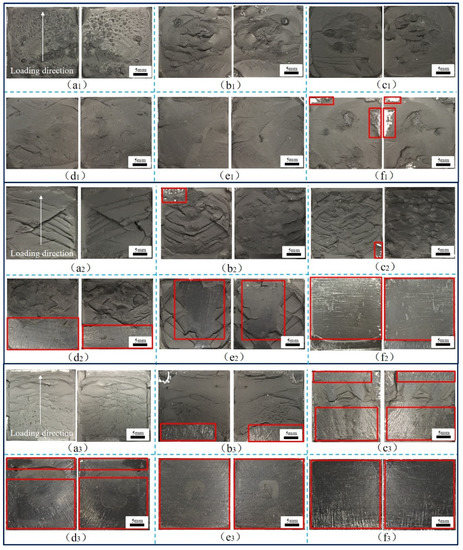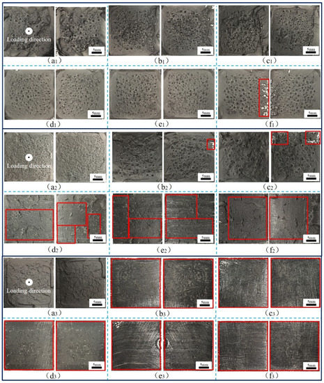 During the operation of a high-speed railway train, the adhesive structure of the train body is in a complex stress state, and the failure modes of the adhesive system are complex, including cohesive failure, interface failure, and mixed failure. In addition, the aging of adhesive will reduce the strength of the adhesive structure and directly affect the failure mode under a complex stress state. Therefore, it is necessary to establish accurate failure models of adhesive structures with aging cycles at different temperatures, analyze the crack evolution behavior of adhesive joints under aging and temperature coupling effects, and reveal the mechanism of action and failure. By analyzing the failure sections of the adhesive joints, the typical failure sections of BJs, 45° SJs, and TASJs under different temperature conditions after hygrothermal aging are obtained, as shown in Figure 12, Figure 13 and Figure 14 (the red box indicates the interface failure area).