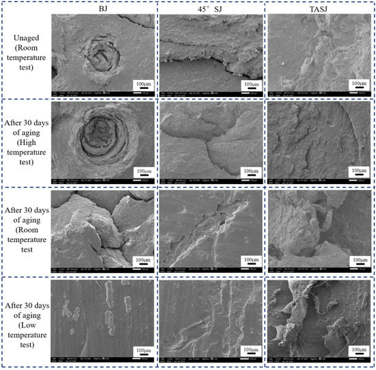 Through SEM, we studied the fracture morphology of the aged joints at different temperatures. Figure 15 shows SEM (100×) micrographs of the fracture surfaces of BJs, 45° SJs, and TASJs without aging and after 30 days of hygrothermal aging.