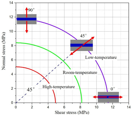 After the same aging cycle, the normal stress and shear stress in BJ, 45° SJ, and TASJ are dispersed, and the stress criterion envelope is formed in the coordinate system with shear stress as abscissa and normal stress as ordinate. Simultaneously, the stress criterion envelope under the whole service temperature range is made according to the failure stress of adhesive joints at different temperatures, as shown in Figure 16. When the combined state of normal stress and shear stress is outside the envelope, it means that the bonded structure will be destroyed, and any combined stress in the envelope indicates that the bonded structure will not fail.