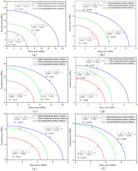 To get the failure criterion of joints under different temperatures after hygrothermal aging, the secondary stress criteria in formula (3) are fitted by MATLAB to form the corresponding envelope of the stress criterion [20]. The fitting curves reflect the relationship between normal stress and shear stress, and the fitting accuracy is compared with the R2 value. The fitting curves, fitting formula, and R2 value are shown in Figure 17; the secondary stress criterion has an excellent fitting effect.