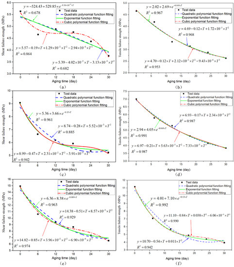 High-temperature test: (a) shear failure strength, (b) tensile failure strength fitting curve; room-temperature test: (c) shear failure strength, (d) tensile failure strength fitting curve; low-temperature test: (e) shear failure strength, (f) tensile failure strength fitting curve.