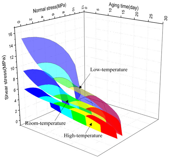 To better show the change of secondary stress criterion with aging time, based on Equations (4)–(6), the three-dimensional surfaces of failure criterion were established by MATLAB software, so that the change of secondary stress criterion with aging cycle could be better explained, as shown in Figure 19. It is found that with the increase of aging time, the envelope of the secondary stress criterion is narrower, which suggests that the strength of the adhesive joints decreases gradually, which indicates that the adhesive structure is more prone to failure. The failure criterion can be used to evaluate the durability of adhesive structures at service temperature.