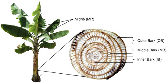 Banana trees were segregated into four different sections: (1) the outer layers of banana bark, designated as outer bark (OB); (2) the middle layers of banana bark, designated as middle bark (MB); (3) the inner layers of banana bark, designated as inner bark (IB); and (4) the middle rib of banana leaves, designated as midrib (MR). All of these sections are shown in Figure 1. The raw materials from each section were then pressed by a metal tube squeezer to remove the inside water as much as possible. Afterwards, they were dried in sunlight for about 15 days.