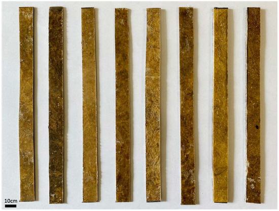 Eight types of composites were prepared in total. For each test or treatment, samples were prepared separately according to the prescribed standards. Experiments were repeated five times for each type of test, and the number of samples was prepared accordingly. All types of sample are described in Table 1. Some prepared samples for the tensile tests are presented in Figure 2.