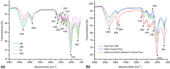 Figure 3 presents the FTIR spectroscopy of different types of raw banana fibers as well as the changes after alkali and water repellent treatments. On the left, IR spectroscopy of raw banana fibers (i.e., OB, MB, IB and MR) shows quite similar major peaks except for some differences in intensity in the range 3400 cm−1 to 600 cm−1. To begin with, the peak at 3335 cm−1 corresponding to O-H stretching in the carboxylic acid group of cellulose was found for all four types of fibers. The higher intensity for OB and lower for MR at this peak defines the highest and lowest potential amount of cellulose content, respectively [40]. Moreover, hydrogen and covalent bonds are developed with these hydroxyl groups by intra- and intermolecular crosslinks, with water bonding at wavenumber 3400–3000 cm−1 [41]. The peak at 2923 cm−1 corresponds to CH2 asymmetric stretching, perhaps due to the appearance of hemicellulose [40]. The intensity at this peak shows the possibility of lower hemicellulose in OB and higher hemicellulose in MR banana fibers. Another major peak at 1632 cm−1 is due to the aromatic C=C in plane alkenes, showing the presence of lignin. Peaks observed at wavenumber 1464 cm−1 due to -C-H stretching also reveal the appearance of lignin. From the intensity, it can be said that OB and MR fiber contain more lignin than the others. Wavenumbers 1420–1430 cm−1 are related to the amount of crystallinity in cellulose [41]. Among the four types of fibers, OB contains a more oriented structure of cellulose, as shown by analyzing the fibers’ respective intensity. The highest intensity for all the fibers at 1018 cm−1 represents the presence of ester C-O stretching.