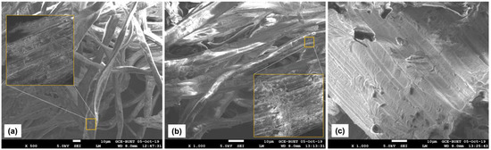 A water repellent chemical was also applied to the surface of nonwovens made of banana fibers. From the micrograph presented in Figure 4c, WR created a thin layer on the fiber surface instead of filling the pores, due to its low molecular weight. As the WR was applied on the nonwoven surface, this thin coating did not interrupt fiber interlocking while making the nonwoven; however, it may still interrupt fiber–matrix adhesion while making the composites.