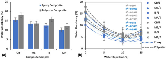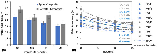 The water absorbency of untreated WR (0% WR + 15% NaOH) composites after 24 h of immersion in water is presented in Figure 7a. The OB/P composite showed the highest water absorbency at 15.55%, while the MR/E composite showed the lowest at 10.16%. OB composites exhibited higher absorbency than all the other types of composites for both epoxy and polyester composites. Between the two types of matrixes, epoxy composites showed significantly lower water absorbency than polyester composites, except for MB composites where the absorbency was similar. For instance, OB/E, MB/E, IB/E and MR/E were found to have 13.44%, 0.43%, 21.16% and 17.03% lower water absorbency than OB/P, MB/P, IB/P and MR/P, respectively.