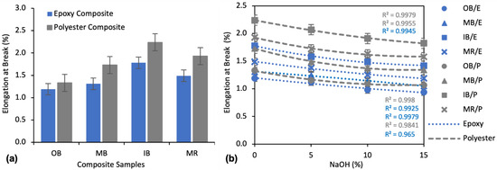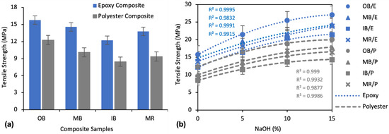 There is an apparent influence of alkali treatment on the tensile strength of the composites, as shown in Figure 9b. It is evident that TS increased with the increase of NaOH concentration. With 5% NaOH treatment, TS was increased by about 35%, whereas an increase of about 60% was found at 10% NaOH and a 75% increase at 15% NaOH treatment, on average, for all types of composites. For instance, at the maximum 15% NaOH treatment, TS was increased by 71.4%, 67.1%, 74.8%, and 72.9% for OB/E, MB/E, IB/E, and MR/E composites and by 63.3%, 75.7%, 69.5%, and 75.8% for OB/P, MB/P, IB/P, and MR/P composites, respectively. The second order polynomial curves prove that the impact of alkali treatment was greater with the 5% and 10% concentrations than with 15% concentration.