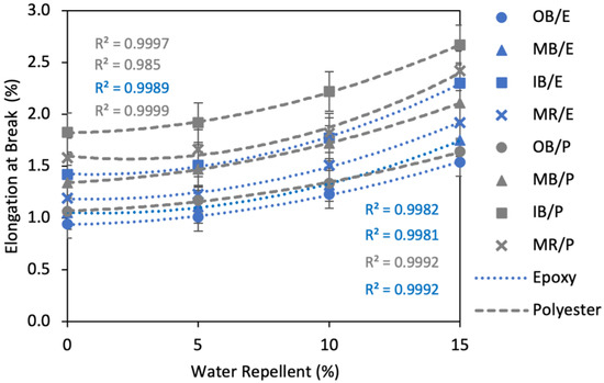 Elongation of the composites increased with increased WR%, as clearly shown in Figure 14. The maximum increase of Eb% was found at 15% WR. For example, OB/E, MB/E, IB/E and MR/E composites exhibited a 63.8%, 66.7%, 62.0% and 61.3% increase, respectively, at 15% WR compared to untreated composites. At 10% WR, the effect was lower; Eb% increased by about 25% on an average for all types of composites. Furthermore, at 5% WR the effect was very low, as Eb% was increased by a maximum of about 10% compared to the untreated composites. The second order polynomial curves also prove this trend.