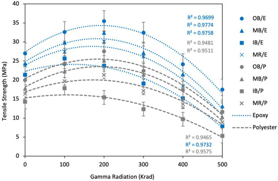 Figure 15 depicts the influence of gamma radiation on the tensile properties of the composites. All the curves demonstrate that gamma radiation improves the mechanical properties significantly to a certain level of dose. The TS of the OB/E, MB/E and MR/E composites were improved by a maximum of 31.2%, 33.3% and 37.7% at a gamma radiation dose of 200 krd, whereas the TS of IB/E was improved by 20.1% at a dose of 100 krd, respectively, compared to non-irradiated composites. However, the TS of the composites was decreased to a large extent by further increasing the gamma radiation dose. For instance, the TS of OB/E, MB/E, and MR/E composites was decreased by 8.5%, 16.3%, and 13.1% at 300 krd, and the TS of IB/E was decreased by 7.4% at 200 krd, respectively, compared to the maximum value. A similar trend was found for polyester composites, with an increased in TS by 37.7%, 41.4%, and 30.0% for OB/P, MB/P, and MR/P composites at 200 krd, and 24.9% for IB/P composites at 100 krd, respectively; however, after this the TS decreased with increased radiation dose. At higher doses such as 500 krd, TS decreased drastically, by 60% on average for all types of composites from the maximum value of TS, which is less than half the TS of even nonirradiated composites. Both the polyester and epoxy composites were influenced by gamma radiation in the same way, though the TS of epoxy composites was improved to a slightly higher degree than polyester composites.