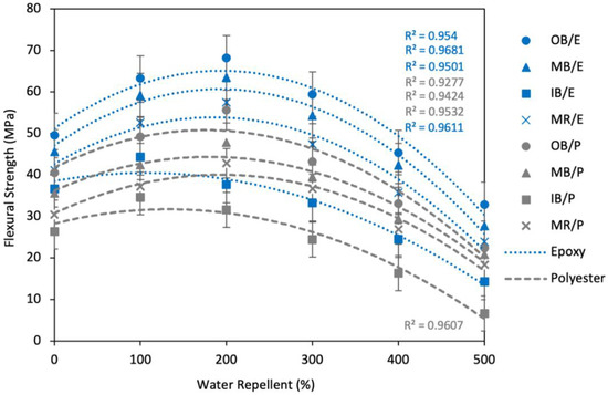 The effect of WR on the flexural properties of the composites are evident from Figure 13. A similar negative trend was found for all the composites; like TS, it declined to a large extent (about 40–50% on average) after treatment with 15% WR, as compared to the untreated composites. However, the effect was much lower at 5% and 10% WR. For example, the FS of OB/E, MB/E, IB/E and MR/E composites declined by 4.4%, 3.9%, 7.5% and 6.0%, while the FS of OB/P, MB/P, IB/P and MR/P composites declined by 4.1%, 2.6%, 11.0% and 8.8%, respectively, at 5% WR when compared to untreated composites.