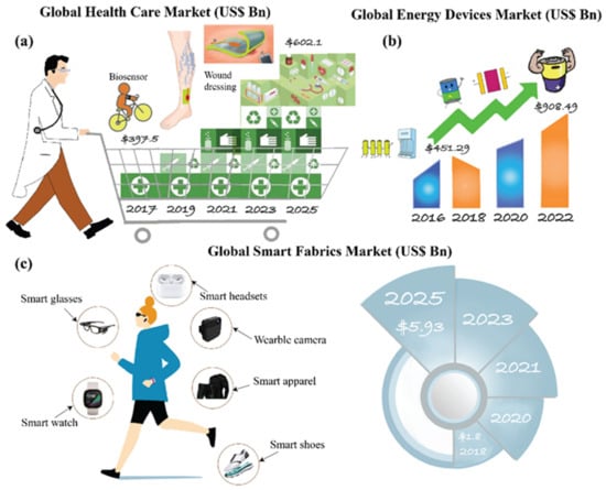 The fourth industrial revolution has remodeled various technological domains including nanotechnology, biotechnology, new materials, artificial intelligence, and human-machine interfaces. This resulted in the conjugation of nanotechnology with medicine and has also driven a new wave into the energy sector [1,2,3]. The effect of this emergence has been evidently noticed in the past two years during the period of COVID-19, when there was a smooth overall outdoor-to-indoor transition through advanced portable miniaturized technologies. Advancement in these different aspects has resulted in the overall amplification of global market value, picturized in Figure 1. In health care [4], the global market value is anticipated to increase from 397.5 to 602.1 billion USD in the timeline from 2017 to 2025 (Figure 1a), where the global energy devices market [5] has projected a 451.29 to 908.49 billion USD enhancement from 2016 to 2022 (Figure 1b) and the global smart fabrics market [6] is estimated to increase up to 5.93 from 1.8 billion USD from 2018 to 2025 (Figure 1c).