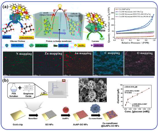 (a) Schematic of the self-powered glucose biosensor; SEM-EDS elemental mapping images of CA/ZIF-8@enzyme/MWCNTs/Au electrode; BET analysis of as-prepared samples [105]. (b) Schematic illustration for the fabrication of Cu-nanoflower/AuNPs-GO NFs-based electrochemical glucose biosensor and FE-SEM image formation of Cu-nanoflowers [107].