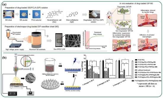 (a) Preparation and evaluation of drug-loaded nanofiber [135]. (b) Graphical representation of the fabrication of scaffolds; preparation of antimicrobial agents/core–sheath nanofiber mats using coaxial electrospinning; efficacy of single and multiple antimicrobial agents containing biphasic scaffolds against mixed-MRSA/P. aeruginosa biofilms using different administration strategies [137].