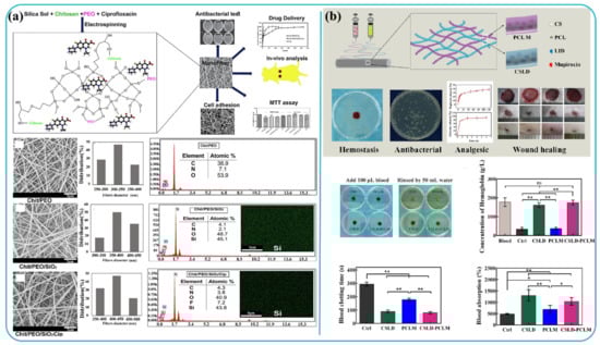 (a) Interactions of the inorganic framework with chitosan and polyethylene oxide; SEM images, fibers size distribution, EDX and X-ray mapping [152]. (b) Schematic Illustration of fabrication process of nanofiber scaffolds; concentration of hemoglobin in blood clots on scaffolds; blood clotting time and blood absorption capacity of the medical gauze control and PCLM, CSLD, and CSLD-PCLM nanofiber scaffolds * p < 0.05, ** p < 0.01 [155].